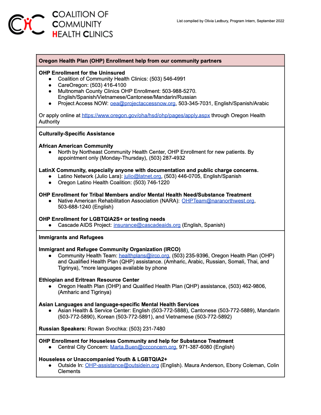To schedule an appointment for OHP Enrollment help or to get your information updated please call CCHC Health Navigator & Enrollment Specialist at 503-546-4991.